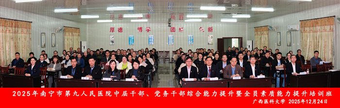 12月24日至26日,由beats365亚洲版继续教育学院承办的2025年南宁市第九人民医院中层干部、党务干部综合能力提升暨全员素质能力提升培训班顺利举办。南宁市第九人民医院党委书记陆华,南宁市第九人民医院党委副书记、院长马兴才,beats365亚洲版继续教育学院院长周波等出席开班仪式并致辞。培训共780余人参加。